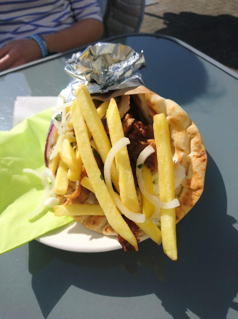 Wir haben im Außenbereich schnell einen Platz gefunden. Die Bestellung lief etwas holprig von statten, denn wir mussten uns bei der freundlichen Bedienung mit einer Mischung aus englisch und deutsch verständigen. Leider wurde nicht alles richtig verstanden und uns dann etwas falsches zu Trinken und zu essen gebracht… Wollen wir mal nicht so sein, der Maracujasaft war lecker und das Pitagyros hat unseren Magen gefüllt.