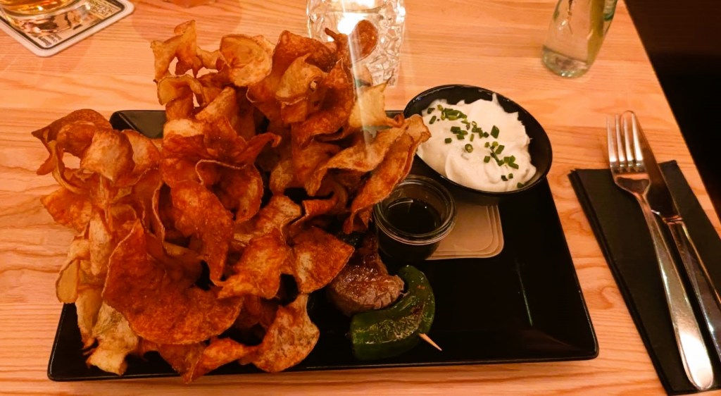 Als Hauptspeise gab es eine Ofenkartoffel mit Sauerrahm, gegrillten Shrimps, Rinderhüftstreifen und einen Roastbeefpiementospieß mit hausgemachten Kartoffelchips. Beide Gerichte waren ganz besonders lecker und wir würden sie genauso wieder bestellen. Für einen Nachtisch war leider nach der üppigen Hauptspeise kein Platz mehr, obwohl sich auf der Karte noch sehr lecker klingende Eissorten befanden und auch von Schokoküchlein die Rede war.