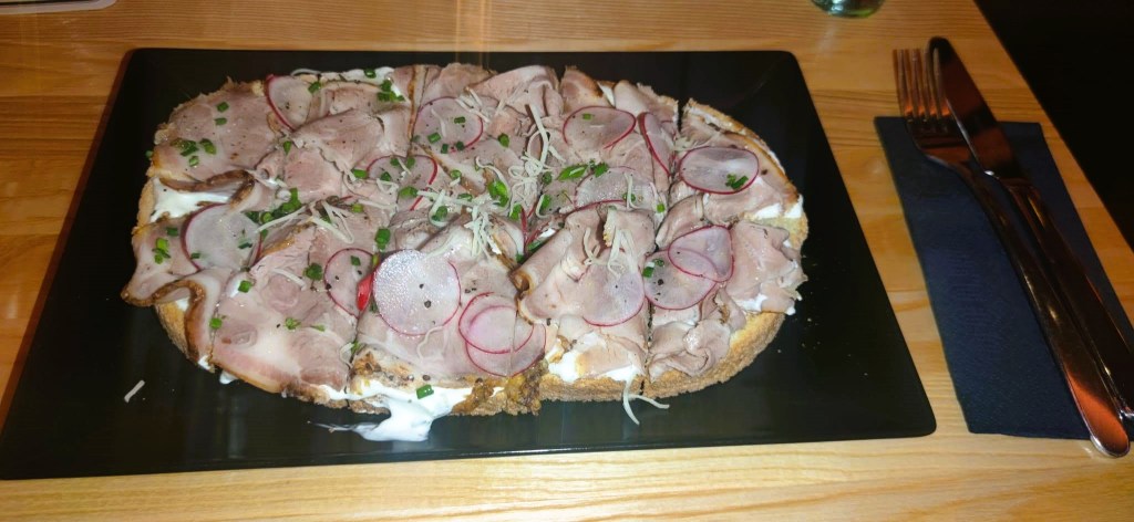 Als Vorspeise ließen wir uns vom „frängischen Bruschedda“ (geröstetes Weißbrot mit Meerrettichcreme, kaltem Braten und Radischen) überraschen.
