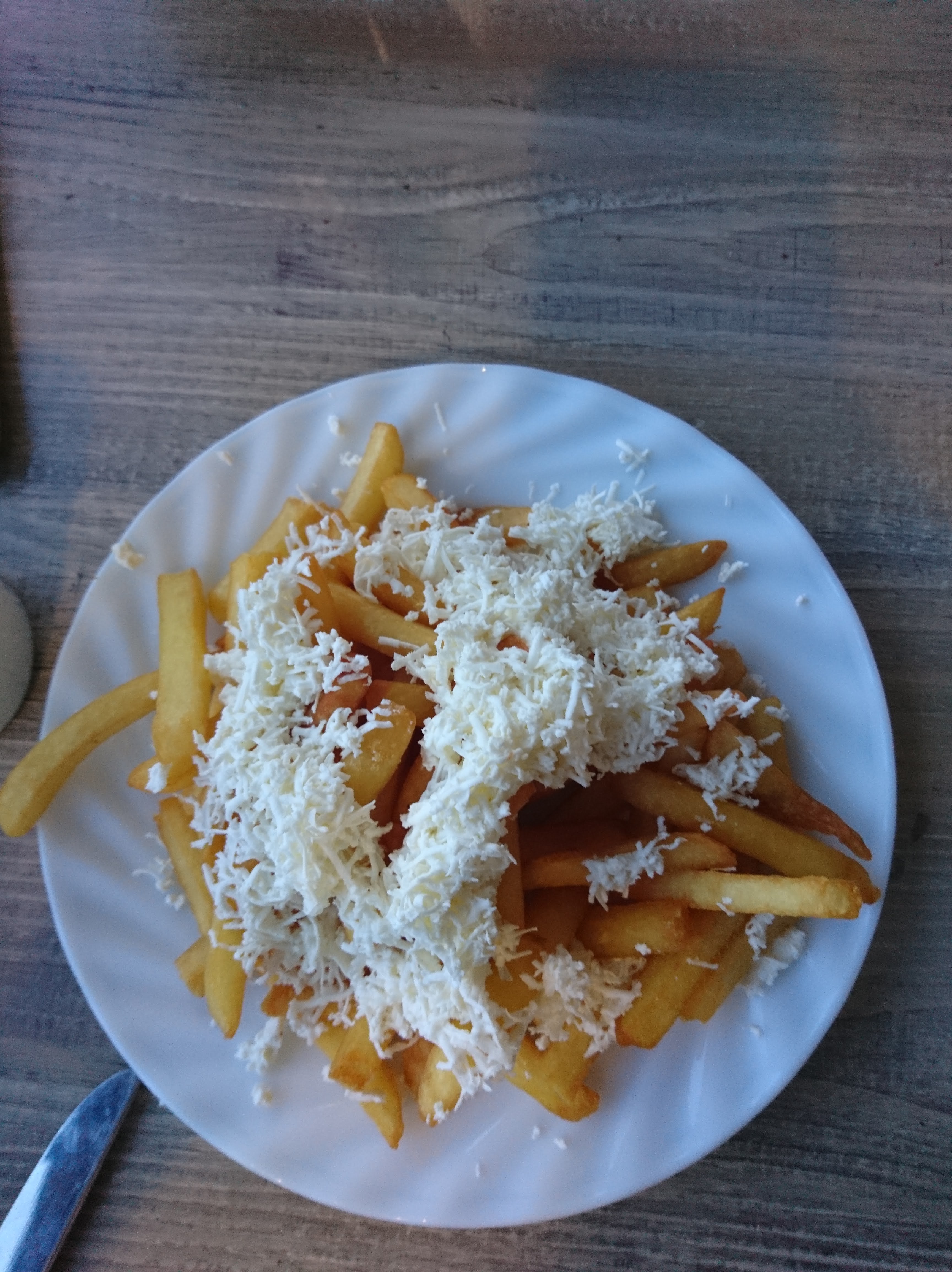 Als Hauptspeise gab es gebratene Tintenfischarme, Muscheln dazu Fritten mit weißen Käse (Landestypisch), Zwiebelringe und eine fangfrische gebratene Makrele.