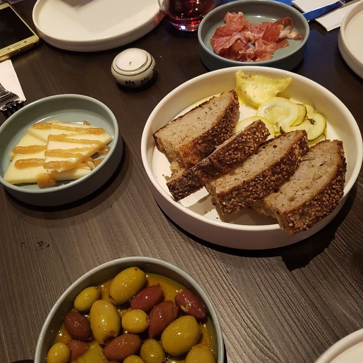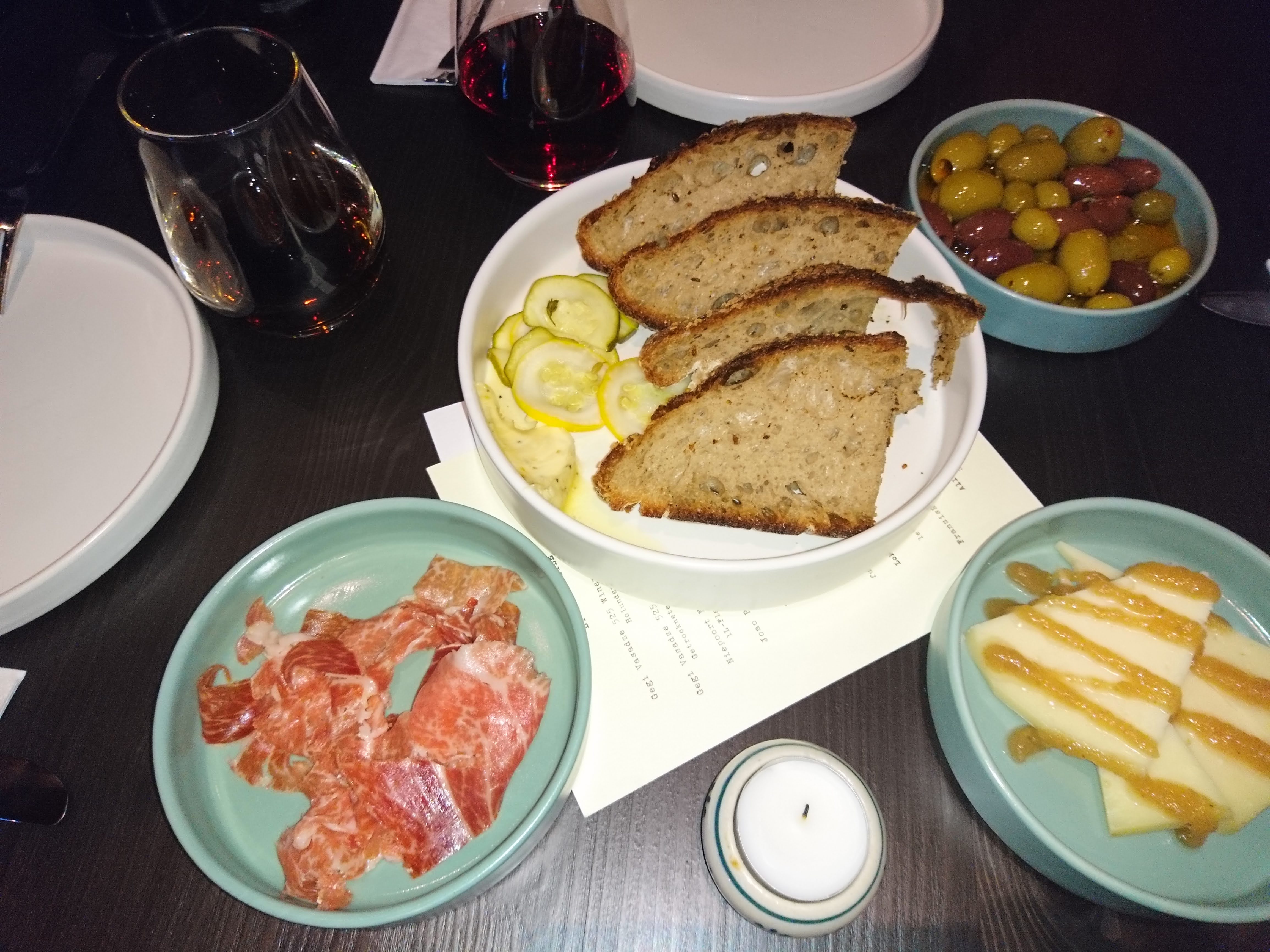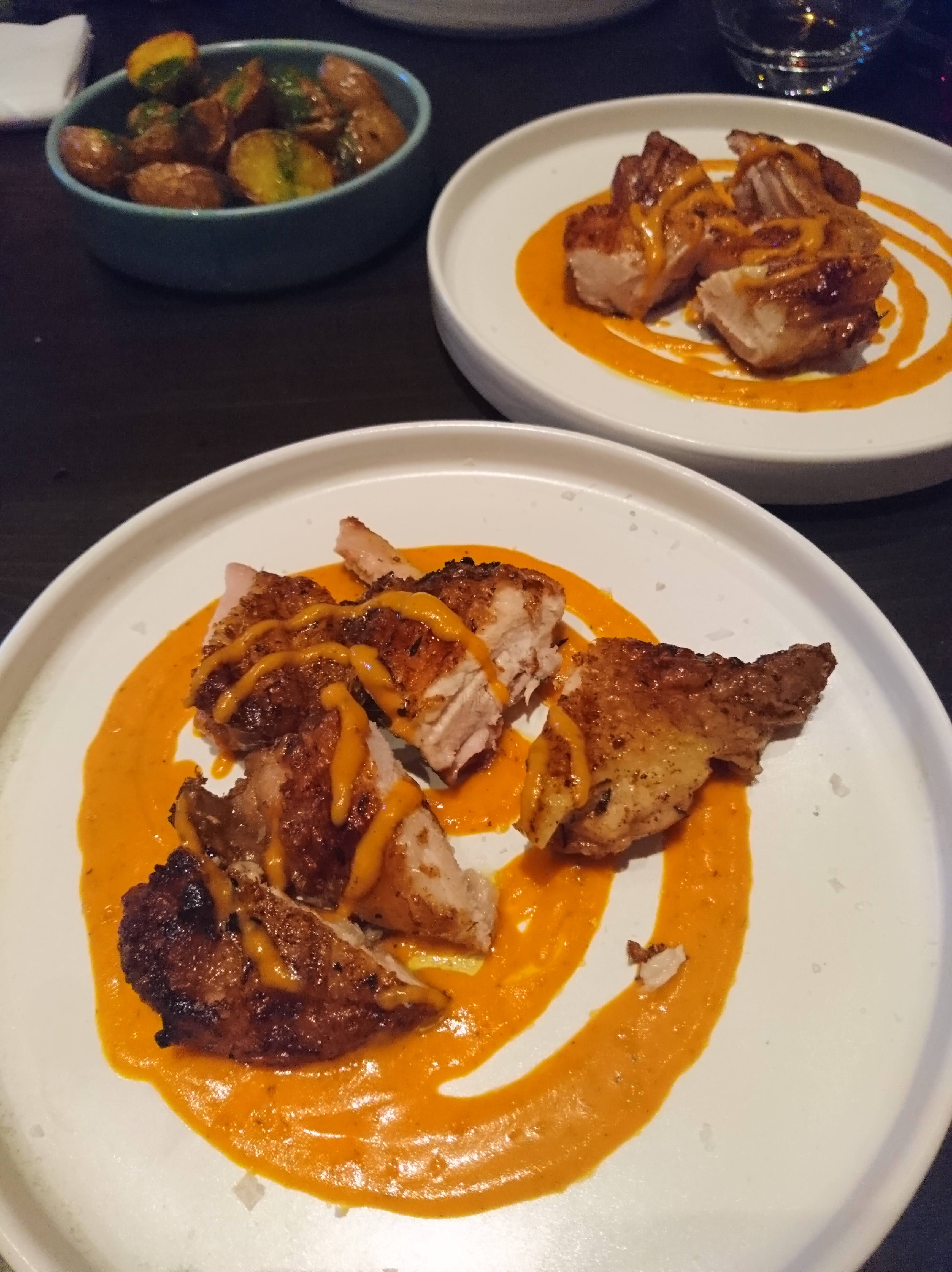 Wie in guten Tapasrestaurants üblich, kann man sich aus vielen kleinen Gerichten, circa 3 bis 4 Speisen aussuchen, um satt zu werden. Zu Beginn ließen wir uns Jamón Iberico, Sardinen-Pate auf Toast und Oliven bringen. Anschließend gab es als warme Gerichte, Hühnchen mit Piri-pirisauce, Calamares Rabas mit Zitrus-Aioli und kleine gut gewürzte Kartoffeln. Alles wurde auf schönen Tellern, modern angerichtet.