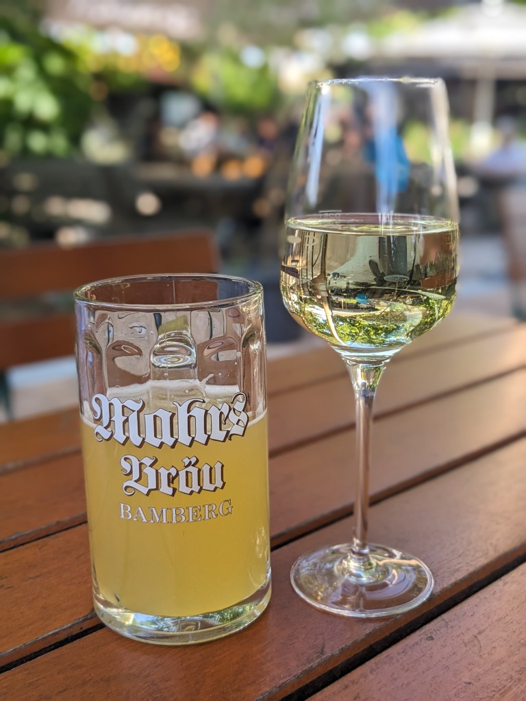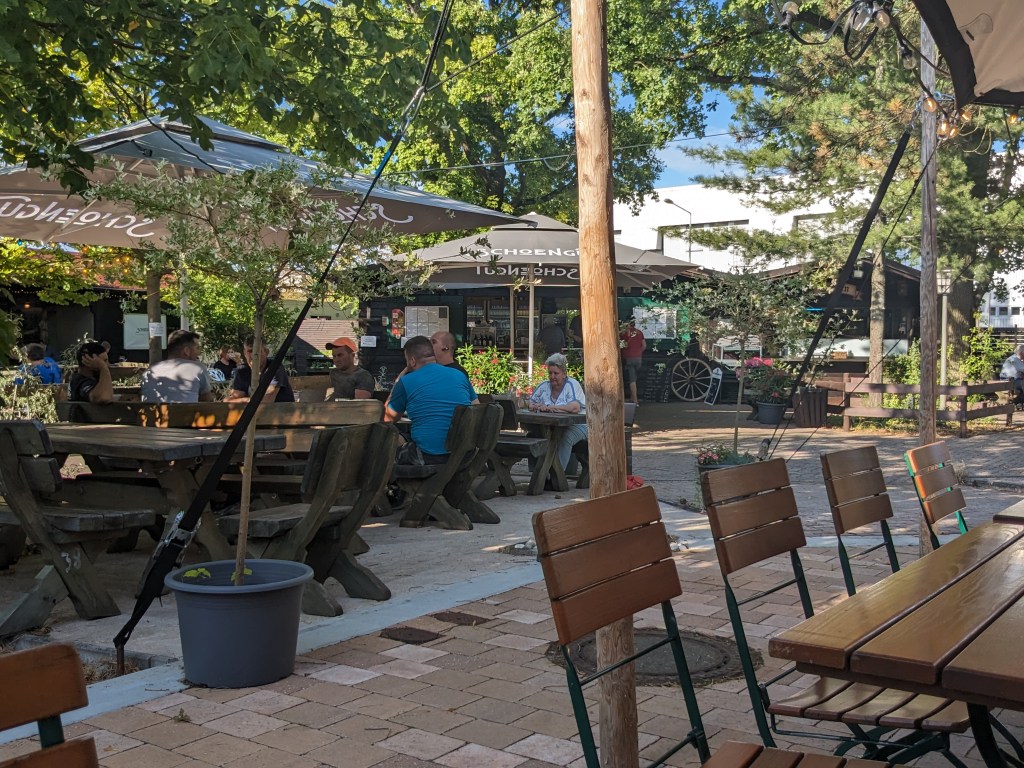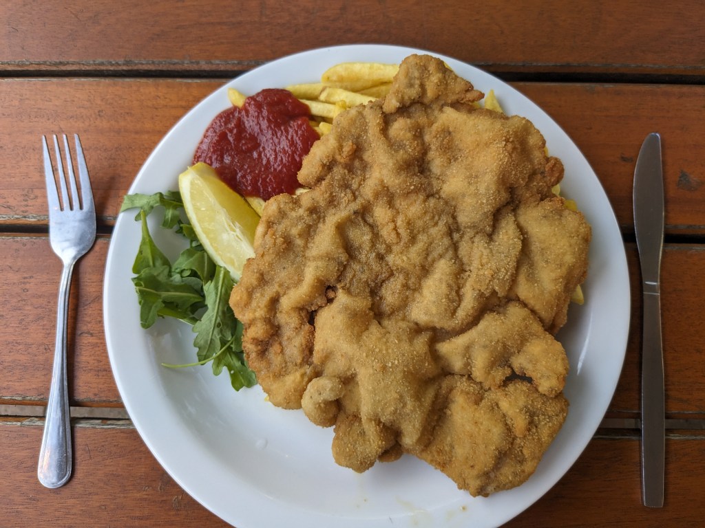 Wir ließen uns bei einem Glas Weißwein und einem naturtrüben Radler, ein leckeres Schnitzel mit Pommes schmecken. Hmmmmmm.