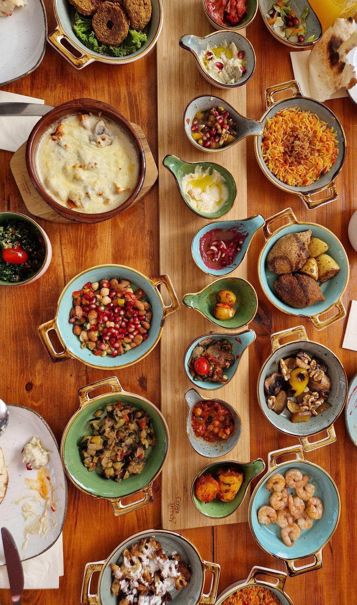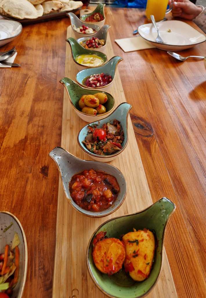 Musakkaa, Hummus, Tabouleh, gegrillter Halloumi, Datteln mit Geflügelbacon, Garnelen in Knoblauch, Baba Ghanoush, das ist nur ein Bruchteil der Speisen, die uns, sehr originell angerichtet, an den Tisch gebracht wurden.