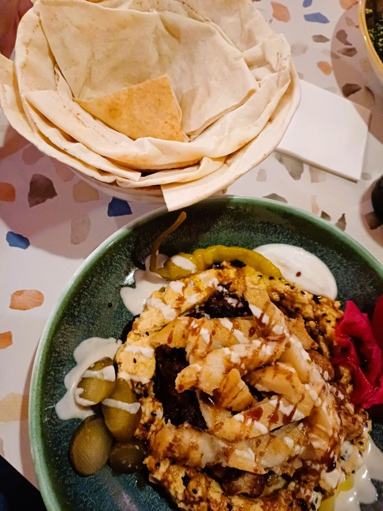 Da wäre als Erstes die Basis, der Hummus in verschiedenen Varianten, dann gibt’s die Toppings, die zum Beispiel aus Falafel, Blumenkohl oder knusprigem Halloumi bestehen können und zu guter Letzt, sucht man sich noch ein leckeres Dressing mit unterschiedlichen Kräutern und Gewürzen aus. Zugegeben, etwas überfordert waren wir, aber wir wollten ja unseren Horizont erweitern. Und wir wurden nicht enttäuscht, die Teller waren buntgefüllt mit den ausgewählten Zutaten, dazu wurde uns noch ein warmes Fladenbrot gereicht. Es schmeckte uns durchweg fantastisch.