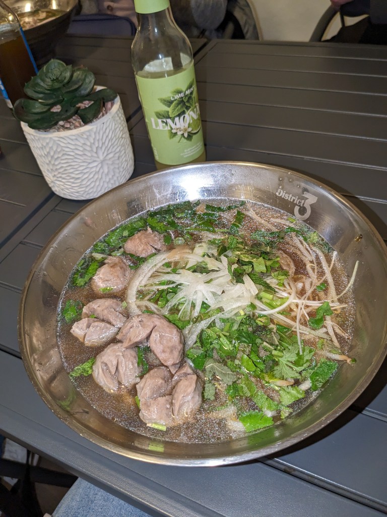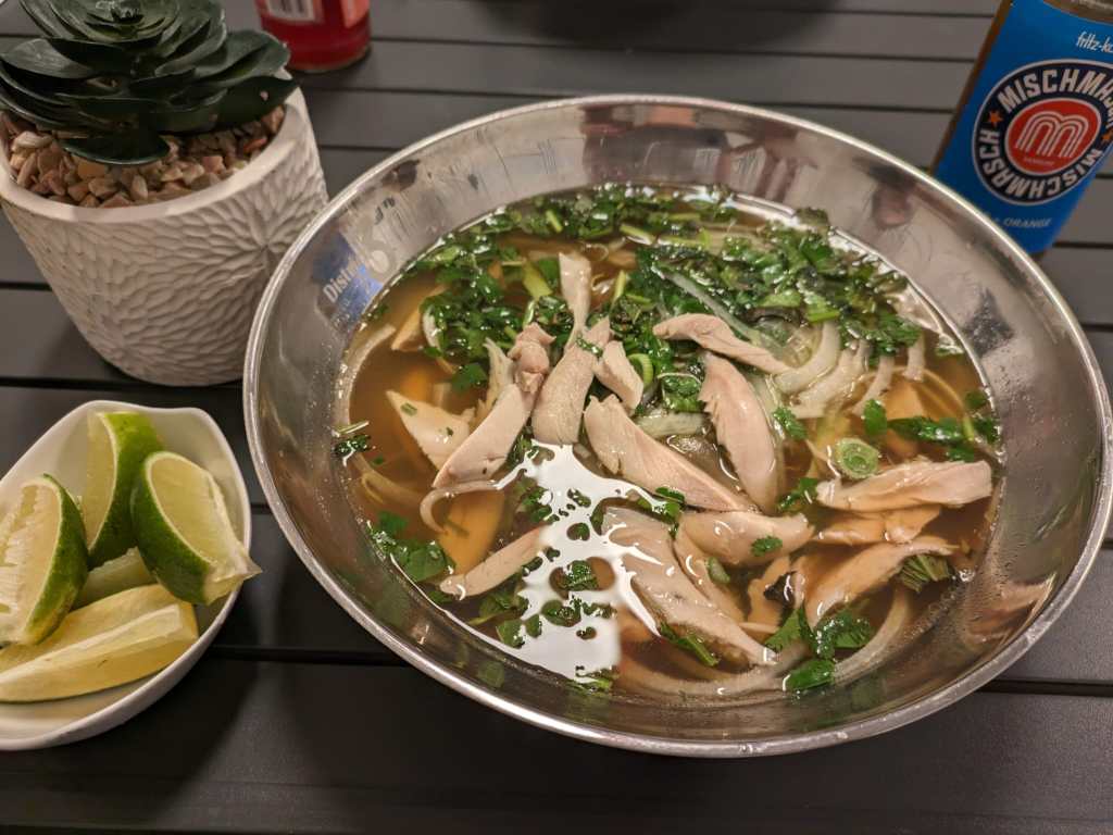 Unsere Wahl fiel auf die typisch asiatische Nudelsuppe mit frischem Koriander Namens Pho Bo Ga, ein Reisgericht mit gebratenem Hähnchen und Bun Bo Hue und eine pikante Rinderbrühe mit Zitronengras und Rindfleisch. Die Gerichte wurden nach kurzer Wartezeit an den Tisch gebracht. Man konnte sich die Speisen noch mit frischer Limette, Chilliesauce oder Fischsauce aufpeppen. Es hat uns gut geschmeckt! Insgesamt würden wir jedoch sagen, dass wir uns ein bisschen mehr Würze gewünscht hätten.
