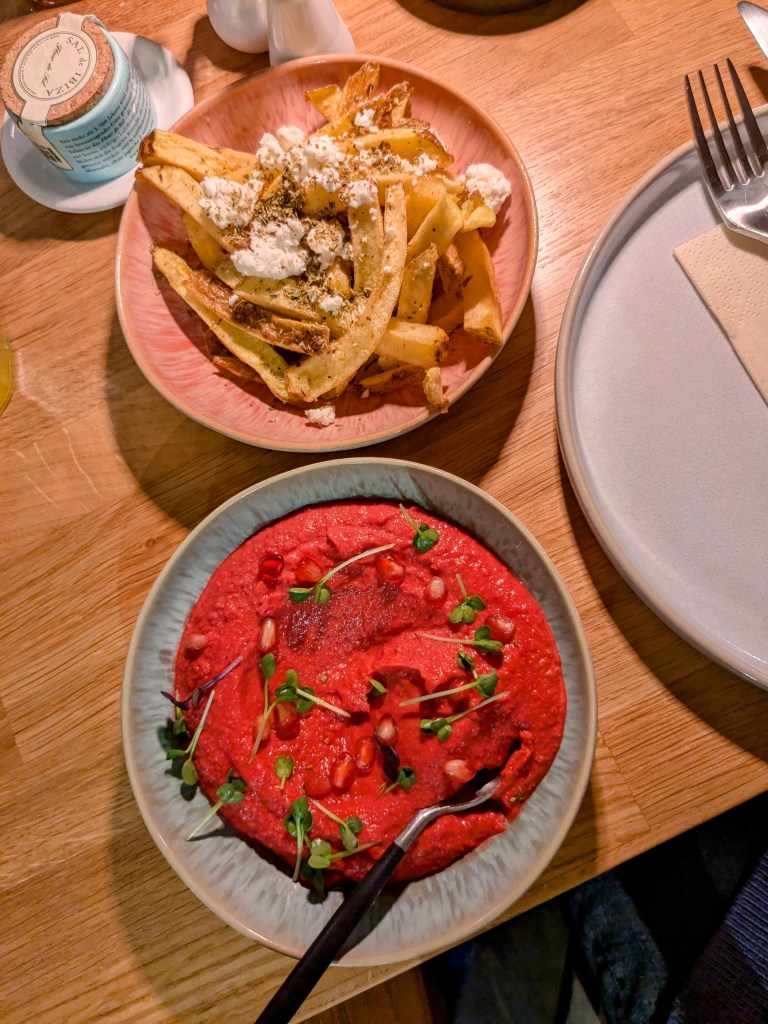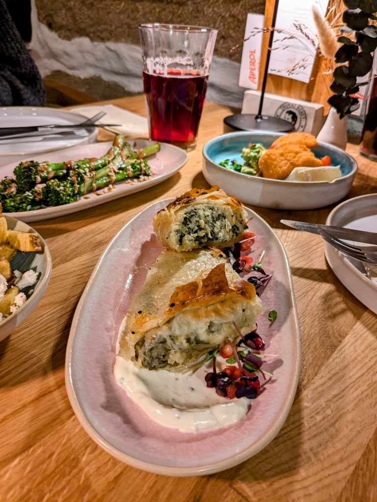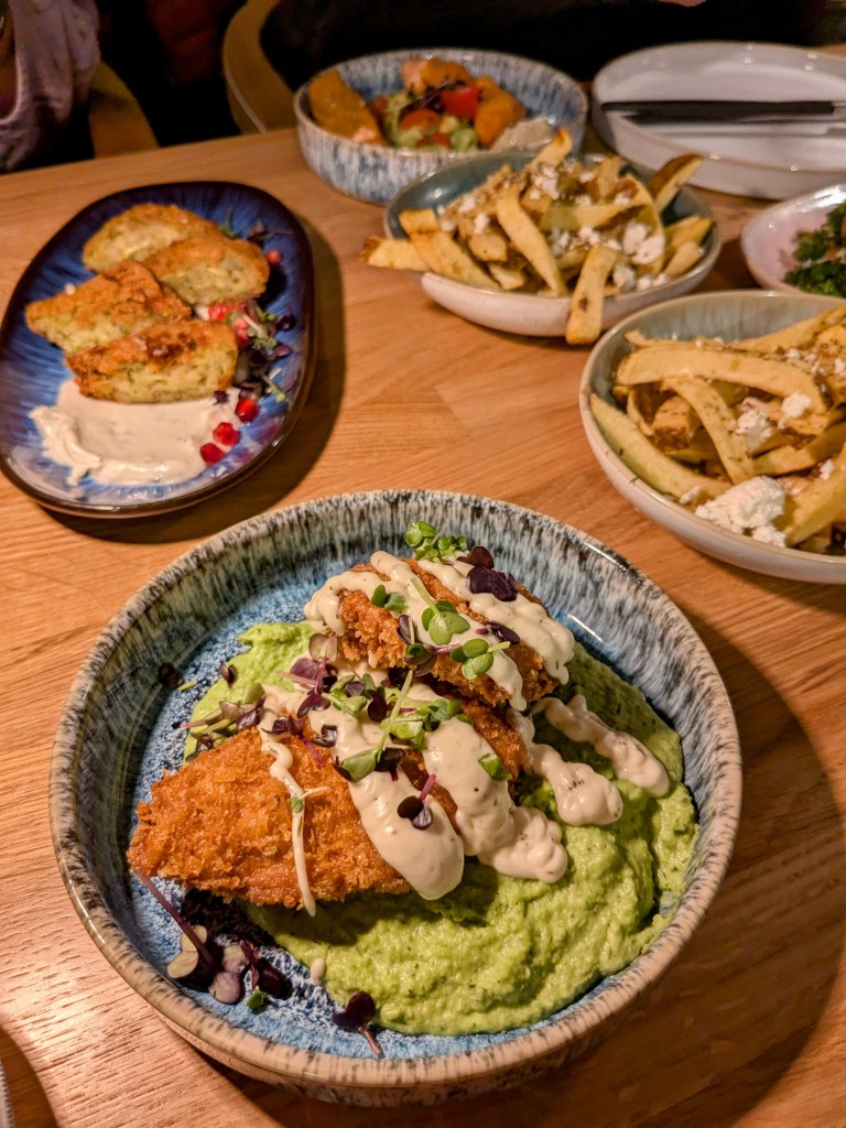 Die Speisekarte ist sehr vielfältig und alles wird mit möglichst regionalen Zutaten zubereitet. Von Vegetarisch, Vegan, Fleisch und Fisch sollte für jeden etwas dabei sein. Wir entschieden uns für Rote Beete Hummus, Zucchiniküchlein, Saganaki Kroustas, Wildbrokkoli, Rustikale Knoblauch Fritten und Lachs im Knuspermantel. Die Speisen wurden frisch zubereitet und kamen nach kurzer Wartezeit zu uns an den Tisch.